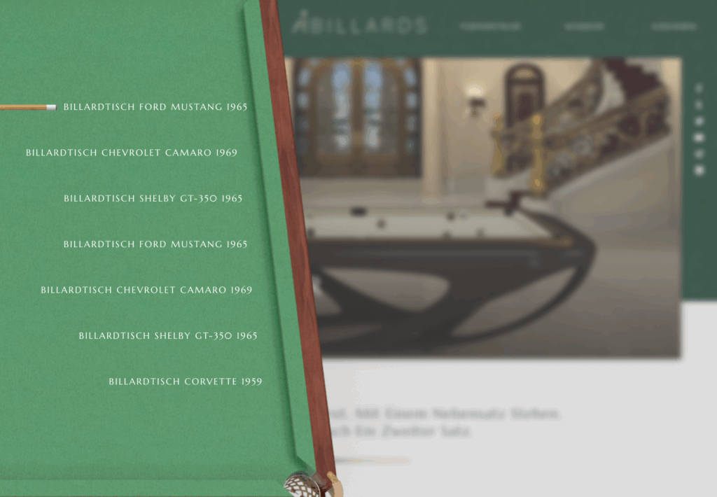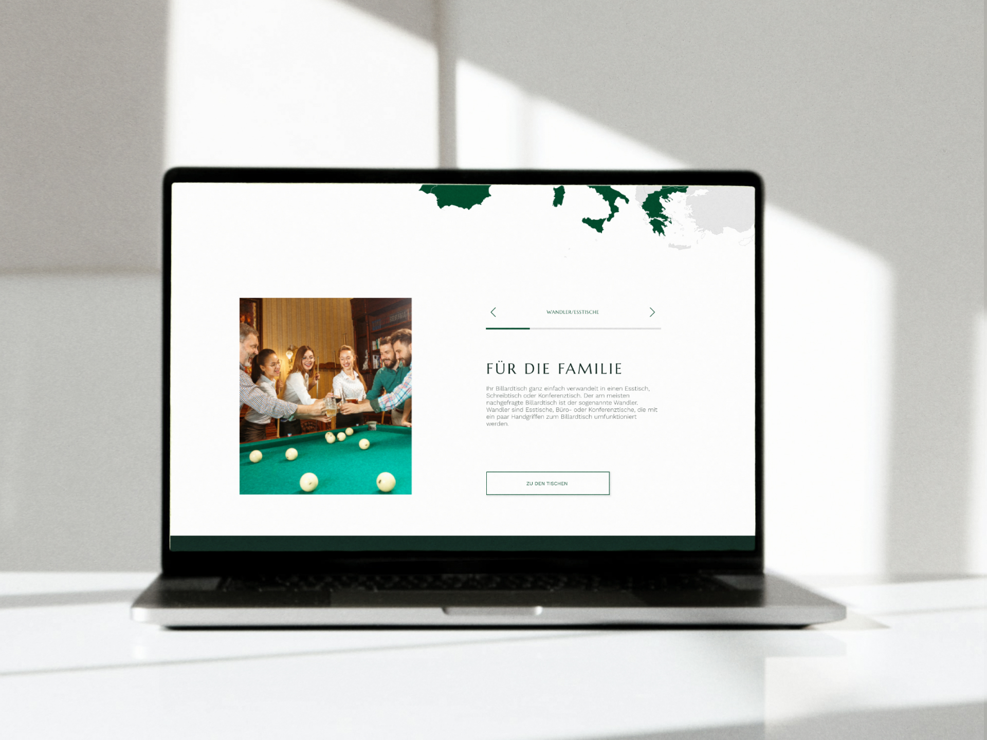 Im Rahmen meiner Tätigkeit bei Pocket Rocket habe ich für einen Billard-Shop ein Mockup für den vollständigen Webauftritt in Figma konzipiert und gestaltet. Das Design entstand in enger Zusammenarbeit mit dem Kunden, um Aufbau, Inhalte und Bildsprache gezielt auf die Zielgruppe abzustimmen. Neben der Gestaltung entwickelte ich Animationen direkt im Figma-Mockup und überarbeitete einzelne Grafiken, wie die Standortkarte, in Photoshop.