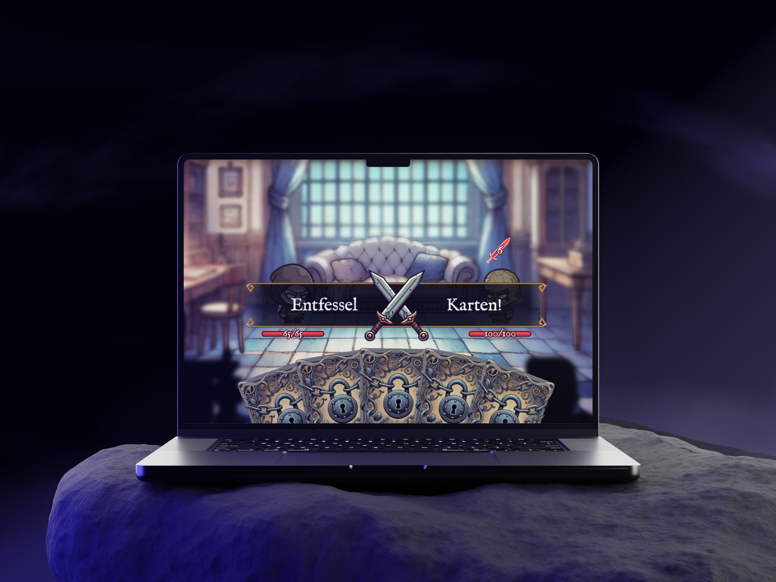 Im Vorfeld meiner Thesis habe ich mit dem JavaScript-Framework Vue.js ein Serious Game entwickelt, das vollständig im Browser läuft. Nach Abschluss der Entwicklung habe ich im Rahmen meiner Thesis eine Studie mit Experiment zur Untersuchung der Akzeptanz von Serious Games durchgeführt. Für das State-Management kam der Pinia Store zum Einsatz, während ich das UI-Design in Figma vorbereitet habe. Die Kartendesigns habe ich mit Stable Diffusion und Photoshop umgesetzt sowie teilweise Assets für die Kartenframes verwendet. Die Animationen habe ich anschließend manuell mit CSS und JavaScript programmiert und das Game State Management über globale Stores gelöst. Die Kommunikation zwischen einzelnen Elementen (Karten, Stapel, Monster und Spieler) im Spiel läuft über Vue Props sowie Stores.